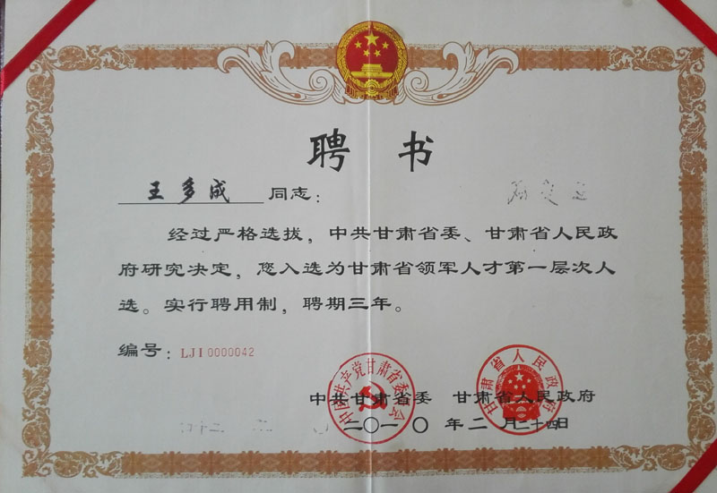 | 2010年榮獲入選為甘肅省領(lǐng)軍人才第一層次人員證書 | ||