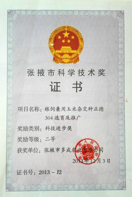 | 糧飼兼用玉米雜交種正德304選育及推廣——張掖市科學(xué)技術(shù)進(jìn)步獎(jiǎng)二等獎(jiǎng) | ||