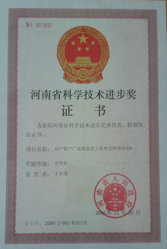 2006年榮獲河南省科學技術進步獎